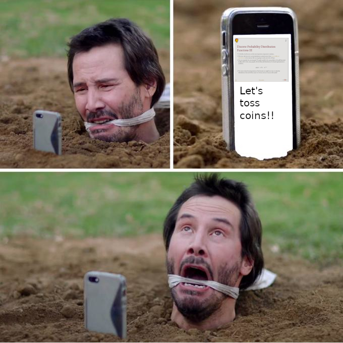 In the R code above, I’m simulating tossing a coin randomly 100 times using the discrete Bernoulli distribution, after doing that I get exactly zeros and ones, as we expected. Now, following the coin toss model, we should have a probability \(p(heads)= 0.50\) in the long run.