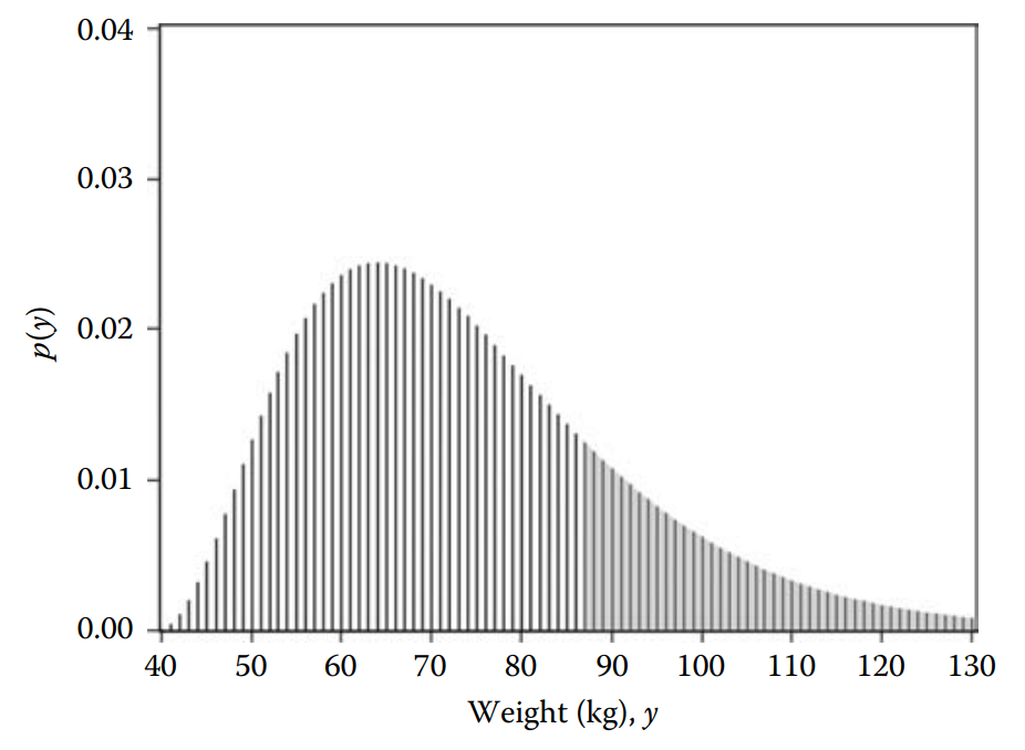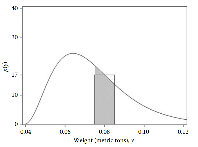 Then the probability of observing a weight (in metric tons) in the range \(0.08 \pm 0.005\) is approximately 17 × 0.01 = 0.17. Or in other words, about 17 out of 100 people will weigh between 0.075 and 0.085 metric tons, equivalently, between 75 and 85 kg.